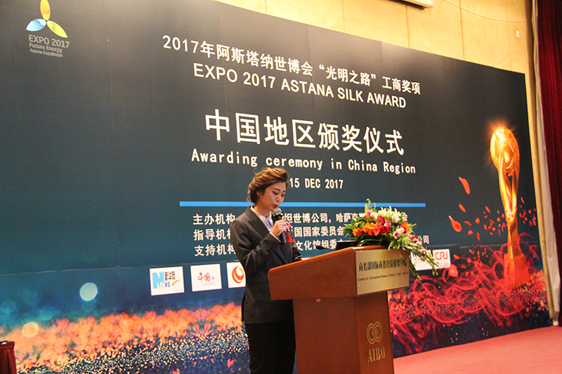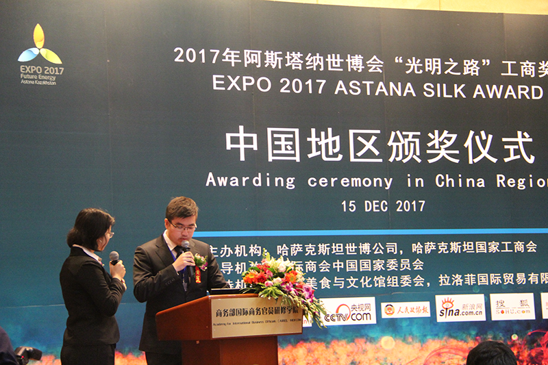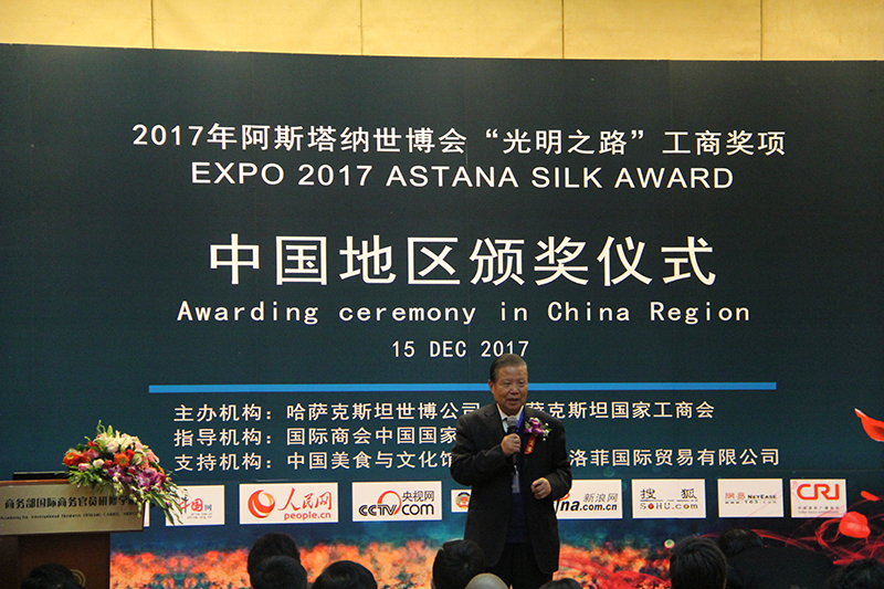 12月15日,2017阿斯塔纳世博会“光明之路“奖项颁奖大会在国家商务部国际商务官员研修中心举行。哈萨克斯坦世博公司,哈萨克斯坦国家工商会,阿斯塔纳世博会国际组织首席代表从哈萨克斯坦专程来华参加大会。著名经济学家、第九、第十届全国政协常委、国务院原参事任玉岭,国家质检总局原副局长、国务院原参事葛志荣,全国工商联办公厅原主任、华夏产业经济研究院执行院长、北京民营科技促进会执行会长路印林等中方领导应邀出席颁奖大会。