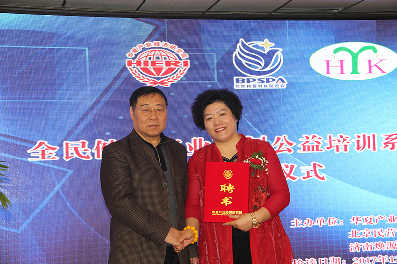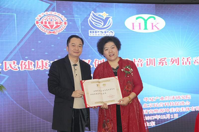 全国工商联办公厅原主任、华夏产业经济研究院执行院长、北京民营科技促进会执行会长路印林为济南焕源坤美容美体有限公司董事长胡玉芹颁发常务副院长聘书。