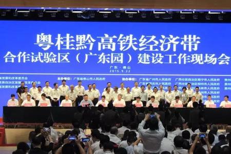 千里粤桂黔,高铁一线牵。2014年12月26日,贵广高铁、南广高铁开通,粤桂黔三省(区)签订推进贵广、南广高铁经济带合作框架协议。去年9月,在广东佛山南海区举办粤桂黔高铁经济带合作试验区(广东园)建设工作现场会暨首届粤桂黔高铁经济带合作联席会议、粤桂黔高铁经济带投资洽谈会等系列活动,沿线13个市(州)由此而逐渐建立起以高铁为纽带,探索跨区域合作新模式。今年4月,试验区(广东园)纳入国务院《关于深化泛珠三角区域合作的指导意见》;7月,各市(州)驻广东园商务联络处揭牌。