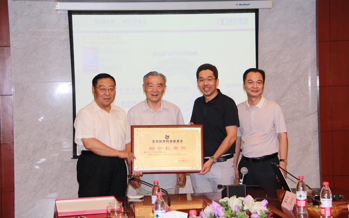 方国辉秘书长向霍建民董事长介绍了北京民营科技促进会的情况,并向霍董介绍了科技创新与转型升级示范基地和金融服务平台、技术服务平台、专家服务平台和国际合作平台,促进会和霍氏文化产业集团公司未来将在国际合作、金融服务等方面全面合作,同时带动促进会中小会员企业共同发展。