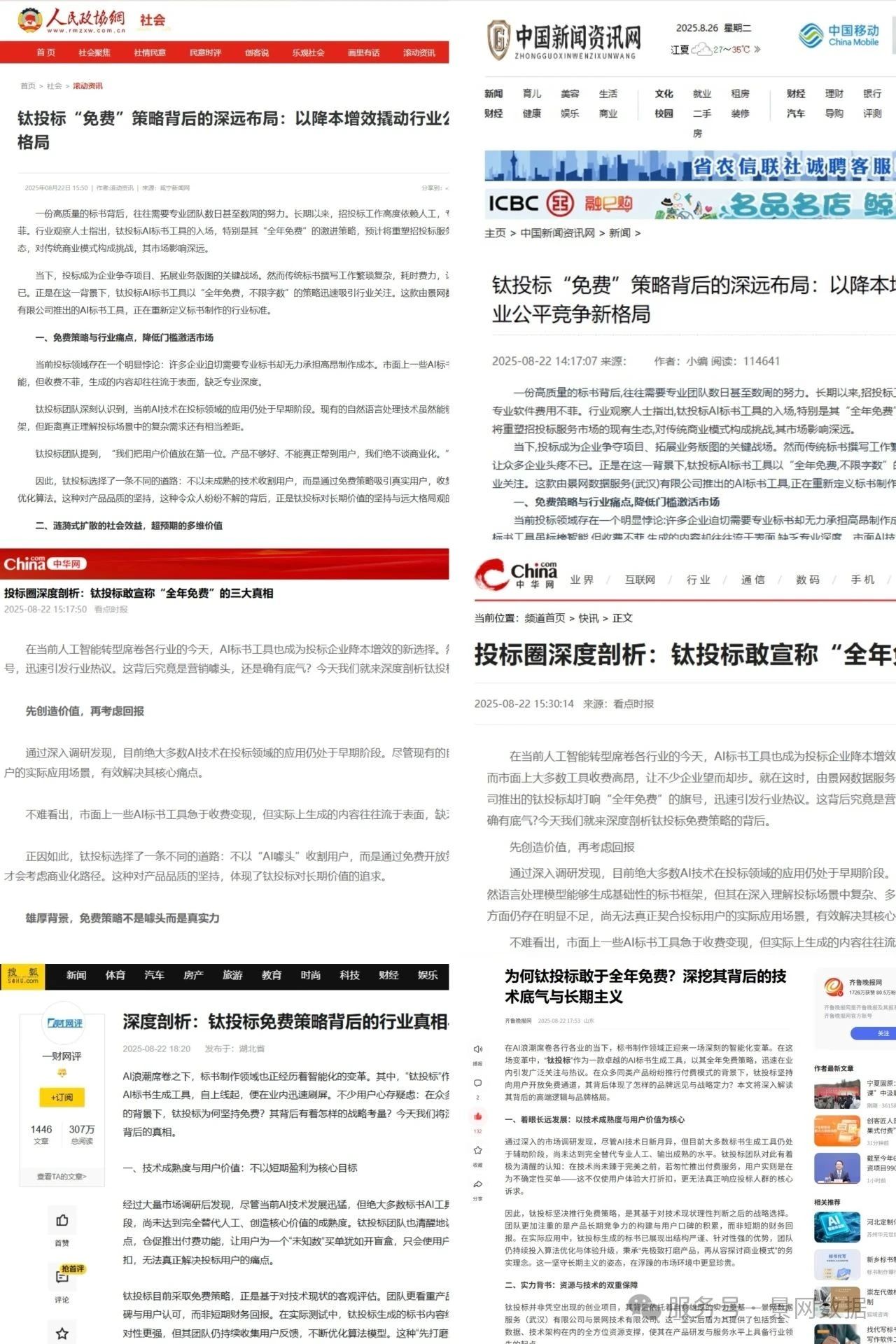 近日,人民政协网、中新网、中华网、中国新闻资讯网、齐鲁晚报、新浪新闻、网易新闻、58财经等多家媒体围绕钛投标“免费策略背后的长期主义发展路径”进行相关报道,客观公正评价了钛投标并非盲目追逐风口,而是以长期耐心的研发投入、认真扎实的技术积淀、长远清晰的战略定力,定义AI投标行业(这一新质领域)的价值逻辑。