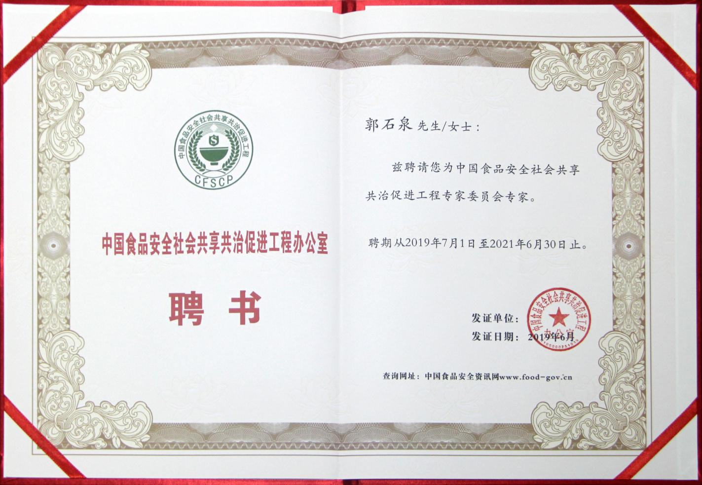 7月22日,中国食品安全社会共享共治品牌管理服务专业委员会成立大会在北京召开,北京民营科技促进会常务副秘书长郭石泉同志被聘为中国食品安全社会共享共治促进工程专家委员会专家,并在大会现场颁发聘书。